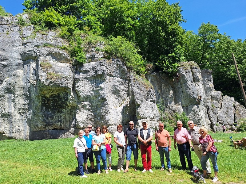 Na koniec dnia, po sytej i zdrowej biesiadzie, ruszyliśmy na długi spacer. Oto nasza grupa pod majestatycznymi skalnymi ścianami, które od wieków pilnują spokoju Doliny Będkowskiej. Maszerowaliśmy raźno, podziwiając wspinaczy na skałach i chłonąc jurajską przyrodę. Ten marsz trwał aż do ciemnego wieczora, a nasze nogi, choć zmęczone, niosły nas z niespotykaną werwą. To pamiątkowe ujęcie to dowód na to, że wspólnota i ruch na świeżym powietrzu to najlepszy fundament aktywnej emerytury.