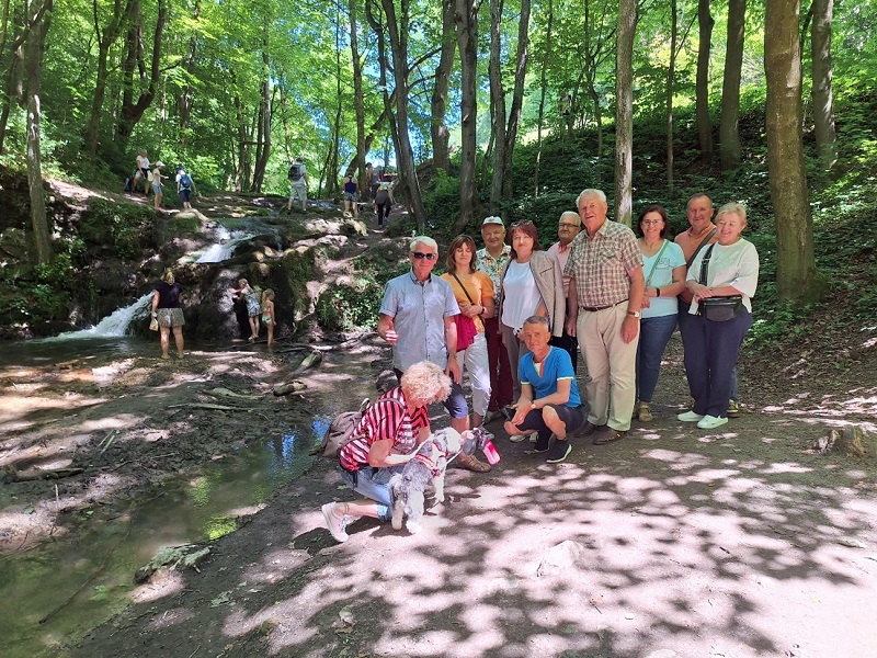 A co z grupą pieszą? Ona również nie próżnowała! Oto wspaniałe zdjęcie z wycieczki na wodospady w Kacwinie. Las był tego dnia naszym sprzymierzeńcem, oferując orzeźwiający chłód. Wśród szumu wody i zapachu igliwia, nasza grupa cieszyła się kontaktem z naturą. Spacery leśnymi duktami to nie tylko ruch, ale też doskonała okazja do wyciszenia umysłu. A nasz wierny czworonożny towarzysz ze zdjęcia dbał o to, by nikt nie zwalniał tempa!