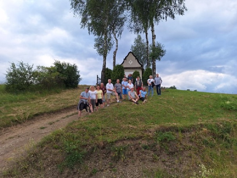 Innym celem naszych spacerów była malownicza kapliczka położona na wzgórzu nad Kacwinem. Podejście wymagało trochę wysiłku, ale dla małopolskich emerytów strażaków nie ma zbyt trudnych tras! Grupa, odpoczywając na zboczu w cieniu brzóz, czerpała energię z zapierających dech w piersiach widoków. Takie wyjścia to idealna okazja do profilaktyki zdrowotnej poprzez integrację – nic tak nie poprawia odporności jak szczery śmiech i rozmowa w gronie przyjaciół na świeżym powietrzu.