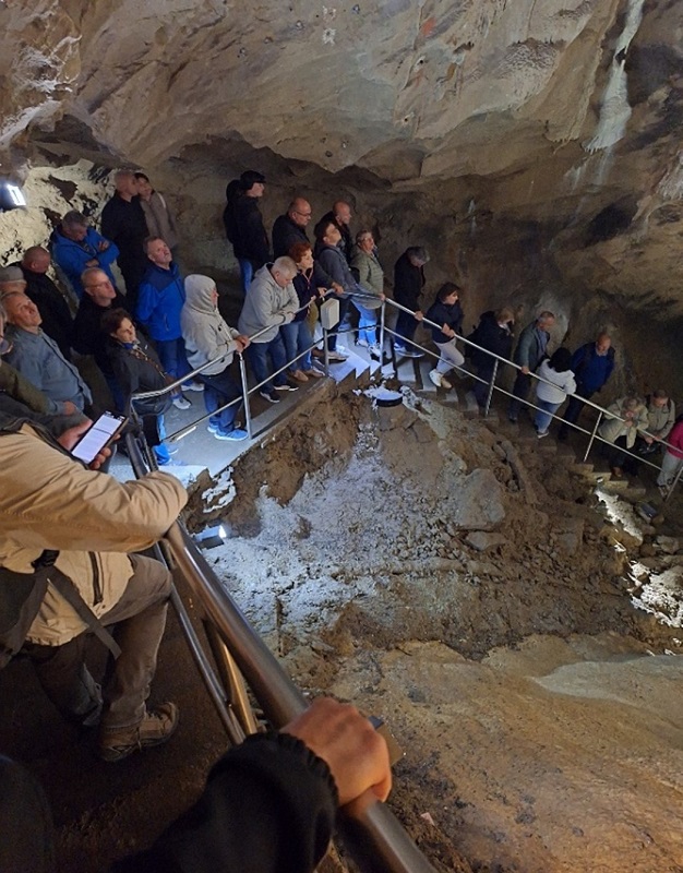To unikalne ujęcie z wnętrza jaskini doskonale oddaje niesamowitą atmosferę podziemi. Nasi emeryci, zafascynowani majestatycznymi stalaktytami, stali się żywym przykładem tego, że strażacka chęć poznawania świata nie gaśnie nigdy. W chłodnych, cichych korytarzach, podziwiając rzeźby natury, czerpaliśmy energię z samej ziemi, czując, jak nasze organizmy się uspokajają i regenerują. To była kolejna lekcja profilaktyki zdrowotnej poprzez turystykę i wspólne poszerzanie horyzontów.