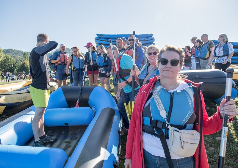 Nadszedł kulminacyjny moment! Spójrzcie na tę imponującą flotę pontonów rozstawioną na trawiastym brzegu Dunajca. Banery z logo „MAŁOPOLSKA” dumnie powiewają na wietrze, potwierdzając, że ten radosny wir wydarzeń to część wielkiego planu wsparcia seniorów. 88 par rąk chwyta za wiosła, a w oczach zapala się młodzieńcza werwa. Te ujęcia doskonale oddają siłę i jedność naszej grupy, która wyrusza na podbój rzeki z uśmiechem na ustach.