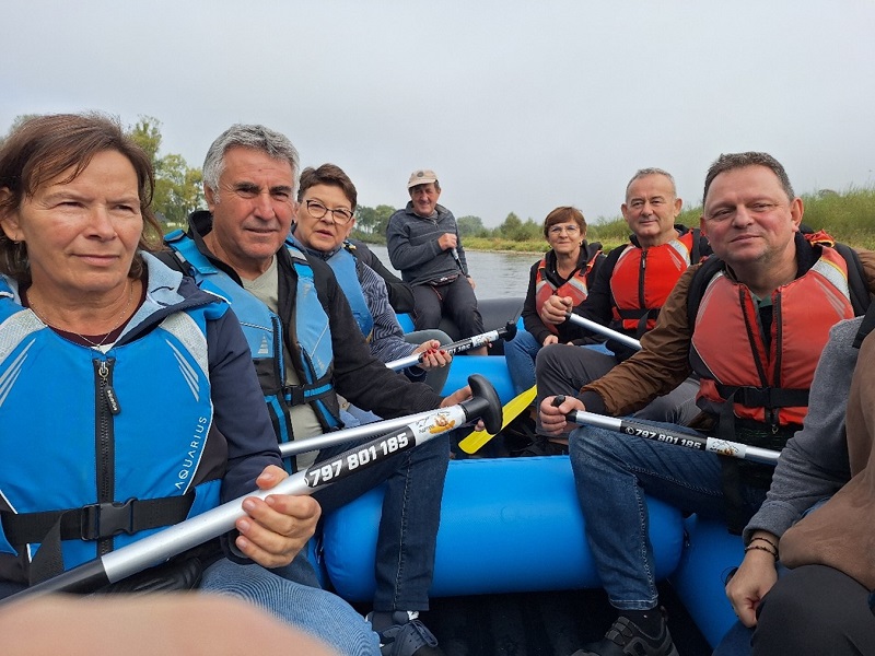 Finał spływu na trasie Sromowce-Krościenko. Ta grupa w pontonie, płynąca w cieniu drzew, to kwintesencja naszej przygody. Choć Dunajec tanecznym krokiem obracał pontony, nasi wioślarze nie tracili werwy. To zdjęcie to symbol jedności i zaufania, które są fundamentem strażackiej braci – na emeryturze silniejszym niż kiedykolwiek. Taka forma ruchu to nie tylko ruch, ale też doskonała profilaktyka zdrowotna poprzez integrację w zgranej drużynie.