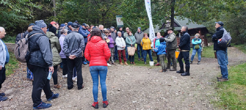 Zanim ruszyliśmy w knieje, odbyła się niezwykle ważna odprawa. Nasz gość, miejscowy leśniczy, z pasją opowiadał o sekretach gorczańskiej przyrody. Słuchaliśmy o życiu zwierząt, które można spotkać na szlakach, oraz o tym, gdzie szukać tych najbardziej wyczekiwanych darów jesieni – rydzów. Co najważniejsze, leśniczy udzielił nam cennej lekcji profilaktyki bezpieczeństwa: jak opisać swoją lokalizację w lesie w razie kontuzji czy zasłabnięcia. Ta wiedza to klucz do spokoju podczas każdej górskiej wędrówki.